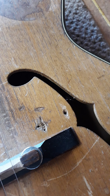 | The Maton as it came to me. The owner had removed the trapeze tailpiece and bridge/saddle from the other Maton. |